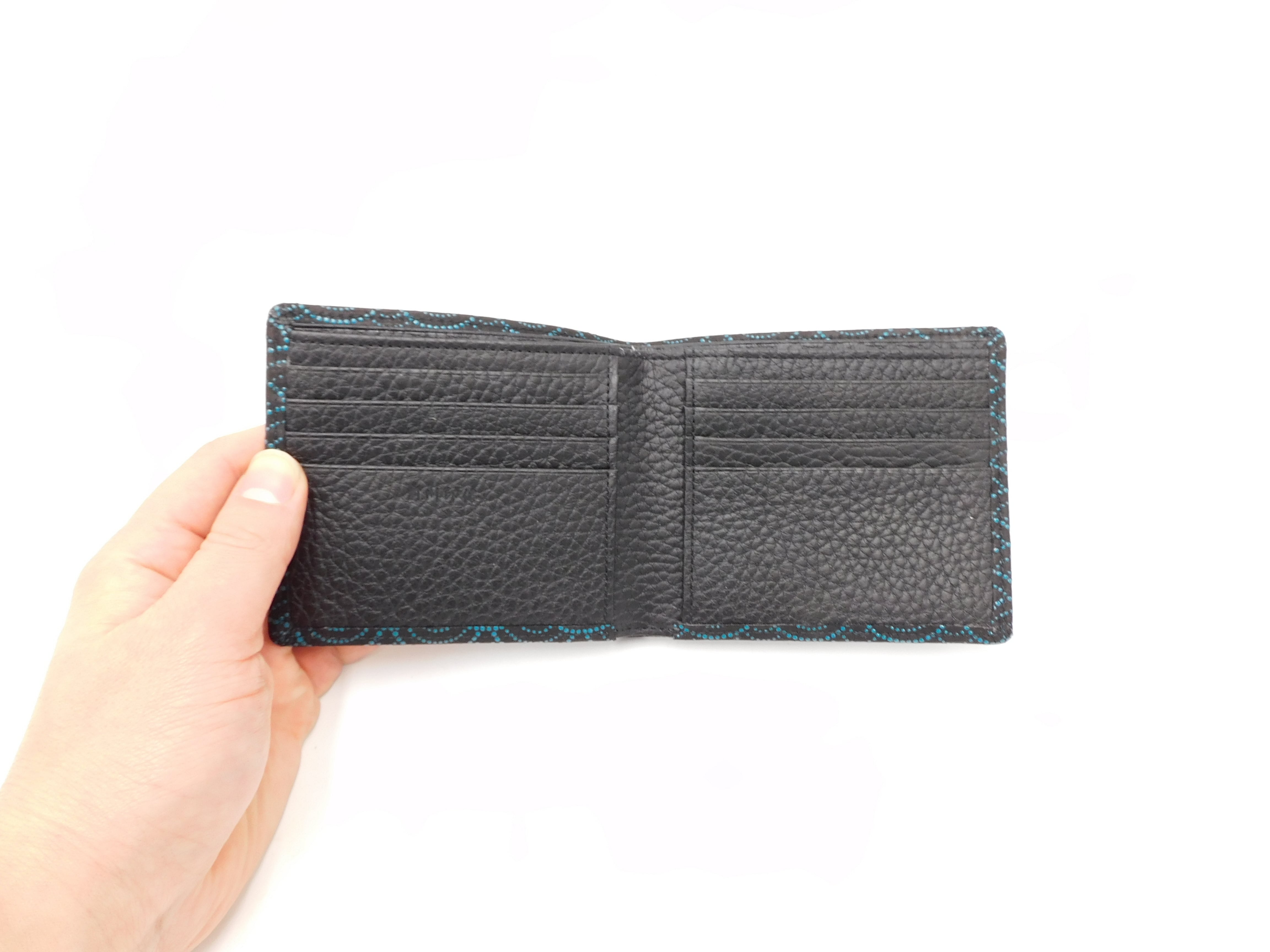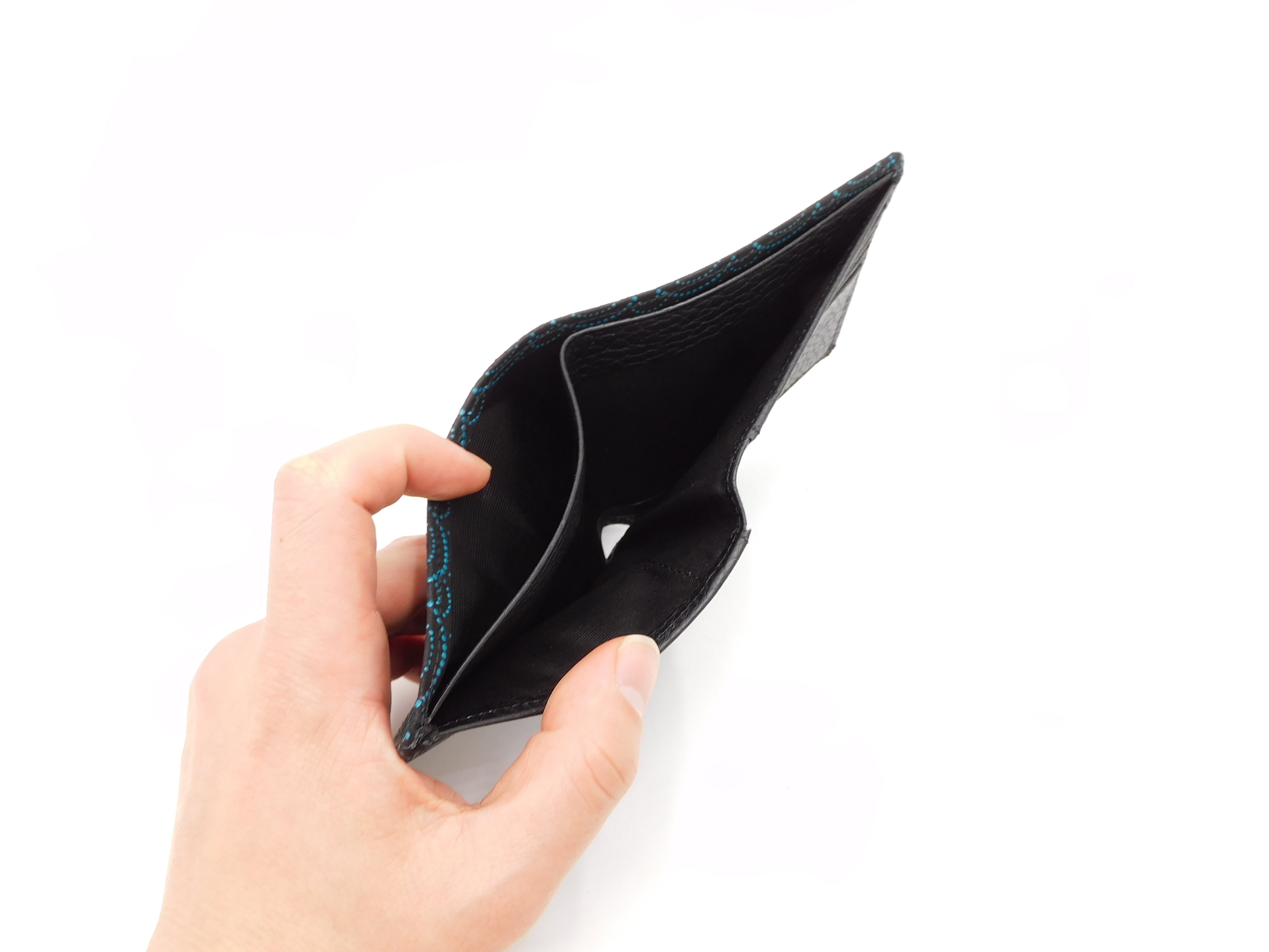 コンパクトなサイズ感ながら、10枚分のカードポケットと仕切り付きの札入れを備え、収納力も十分。
