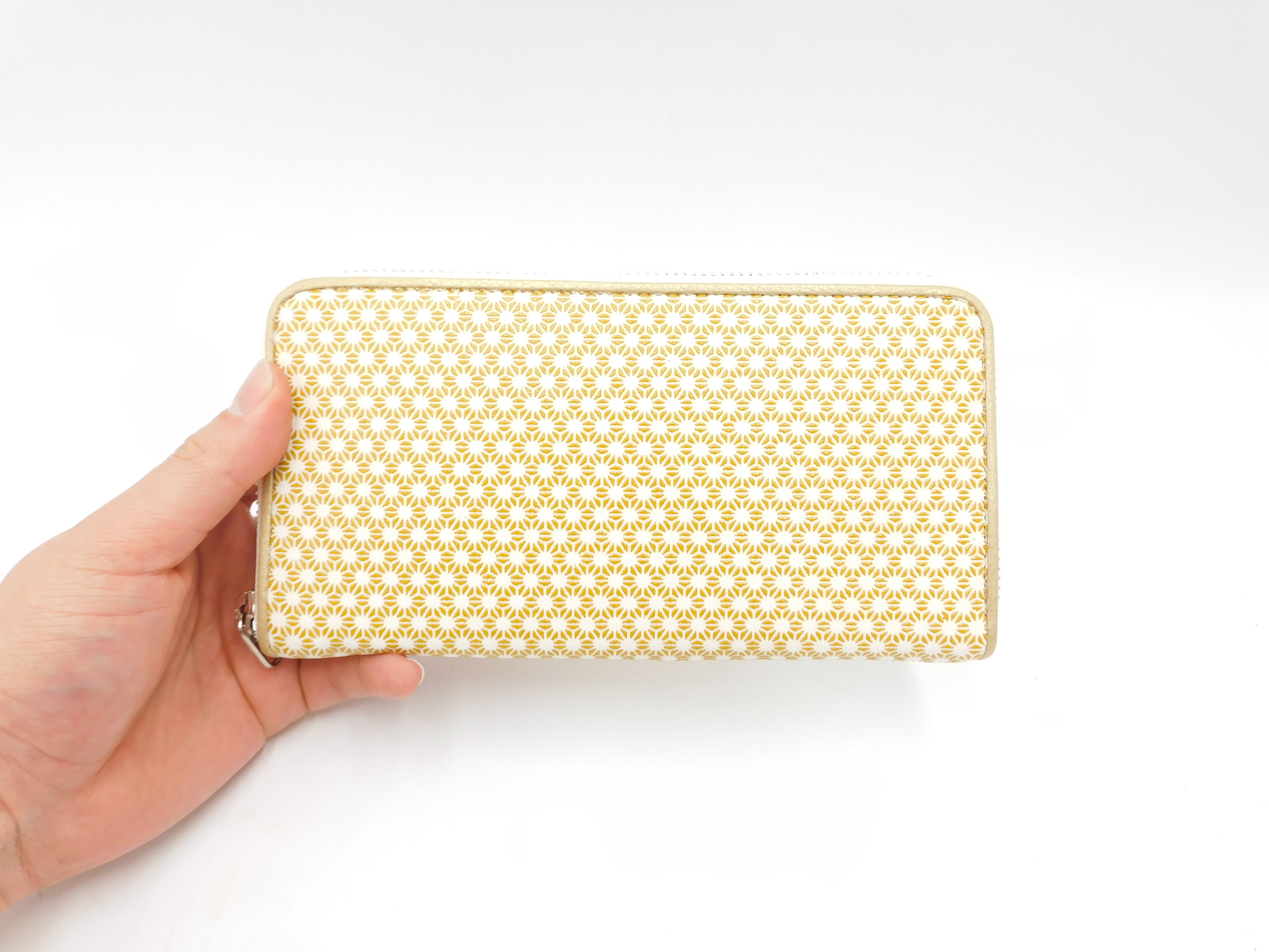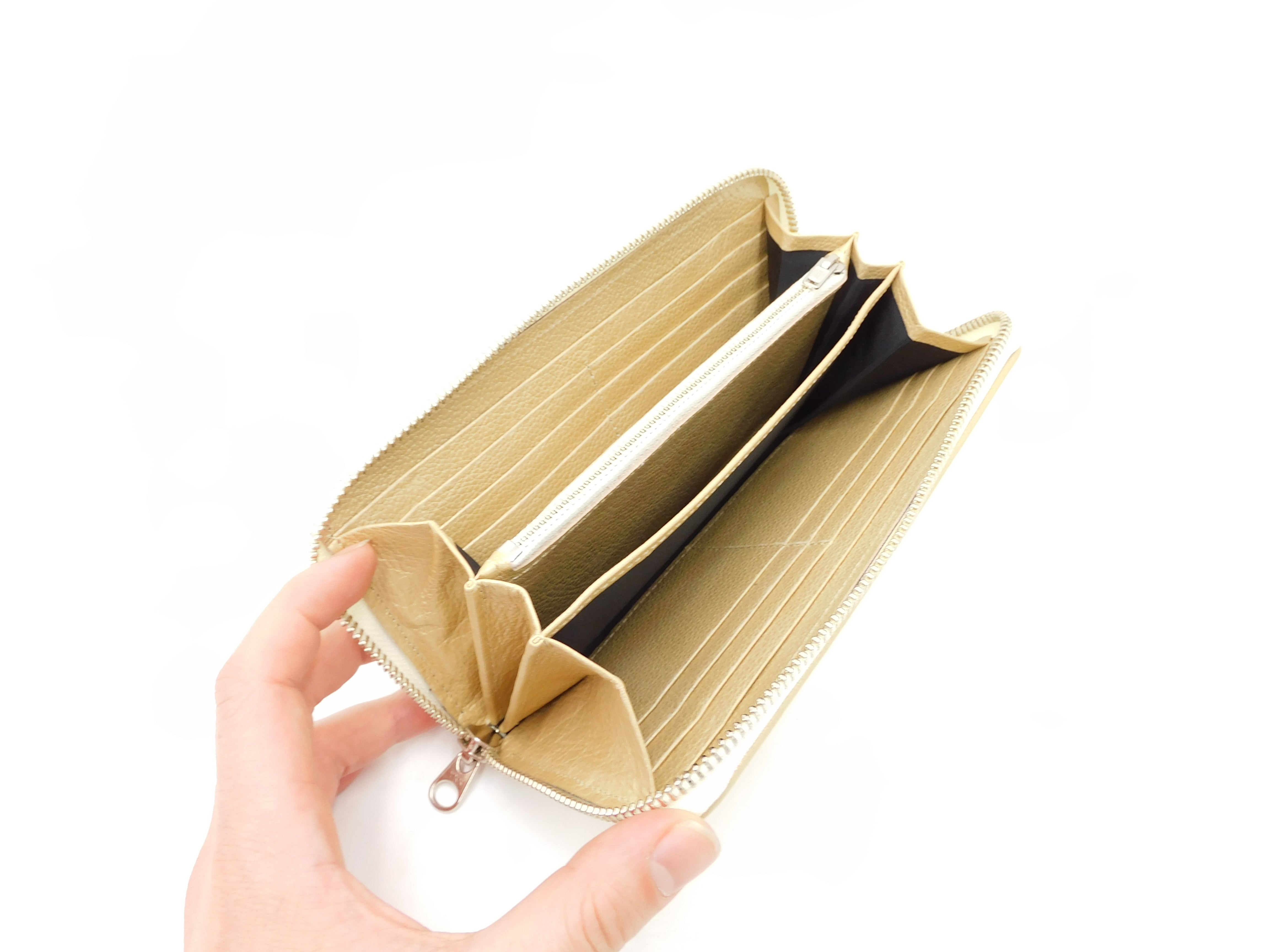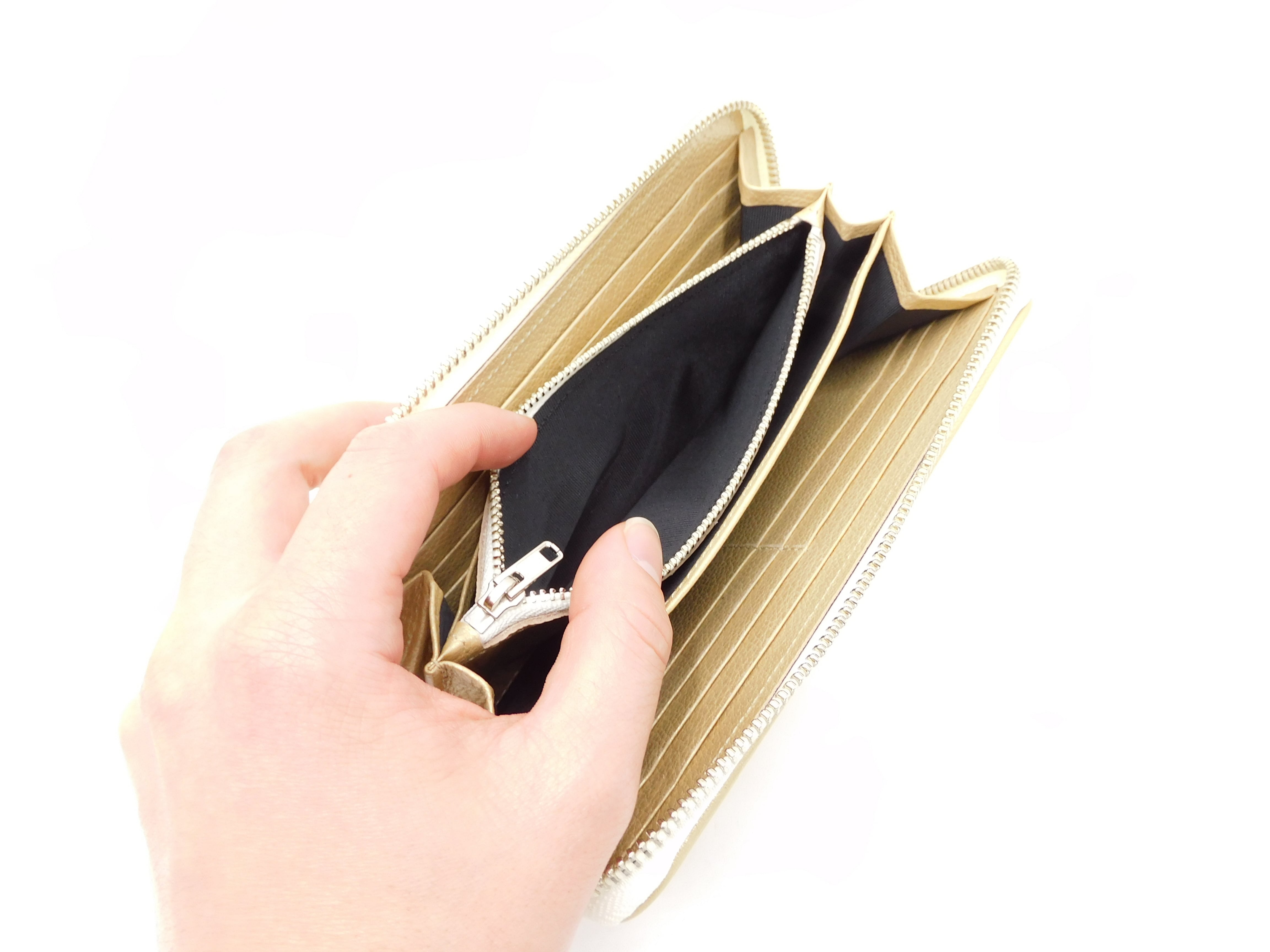 ファスナーでしっかり閉じられる、ラウンドタイプの長財布です。