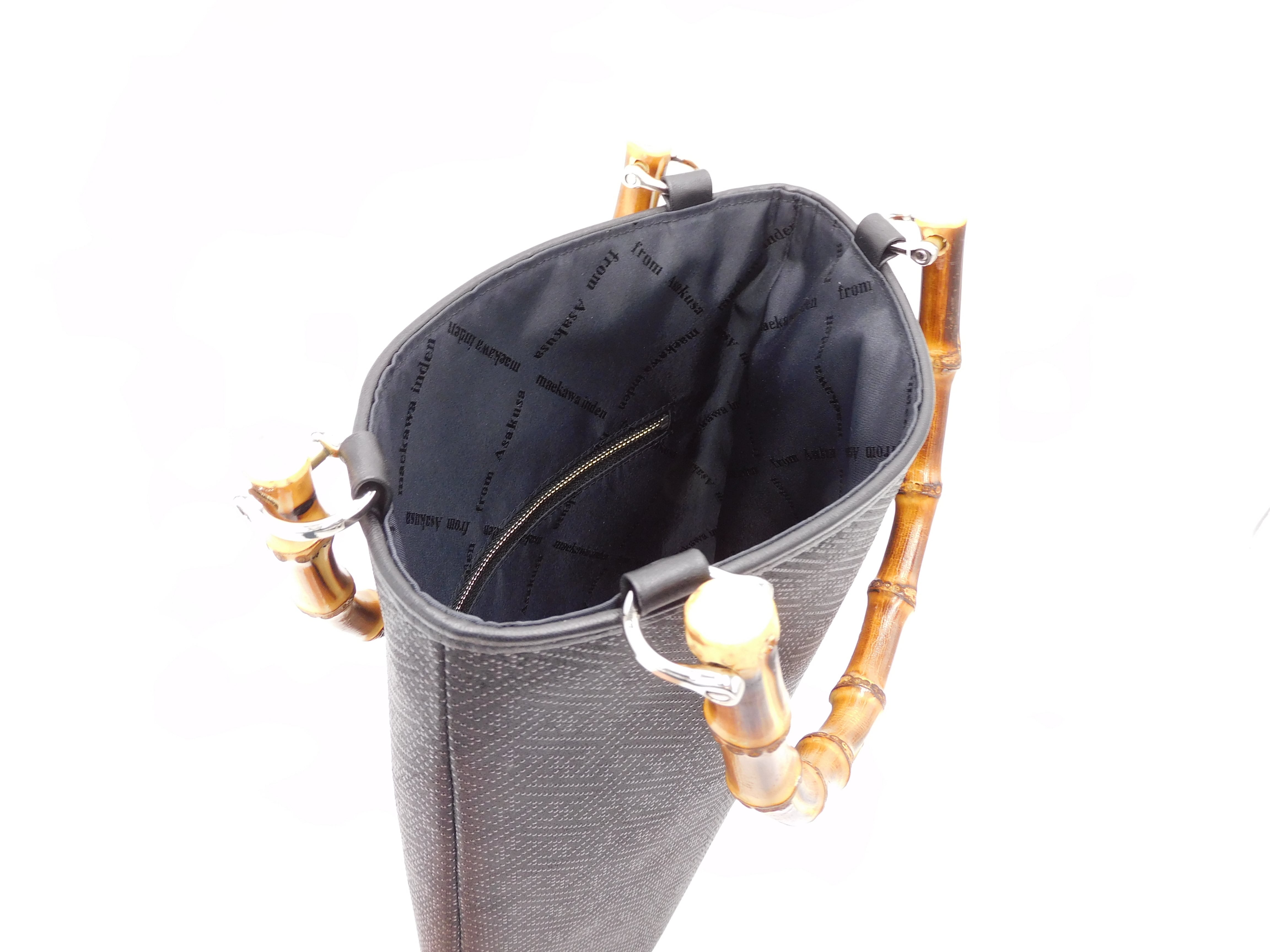 伝統技法による鹿革と漆の美しい模様に、本物の竹の持ち手を合わせた手提げです。