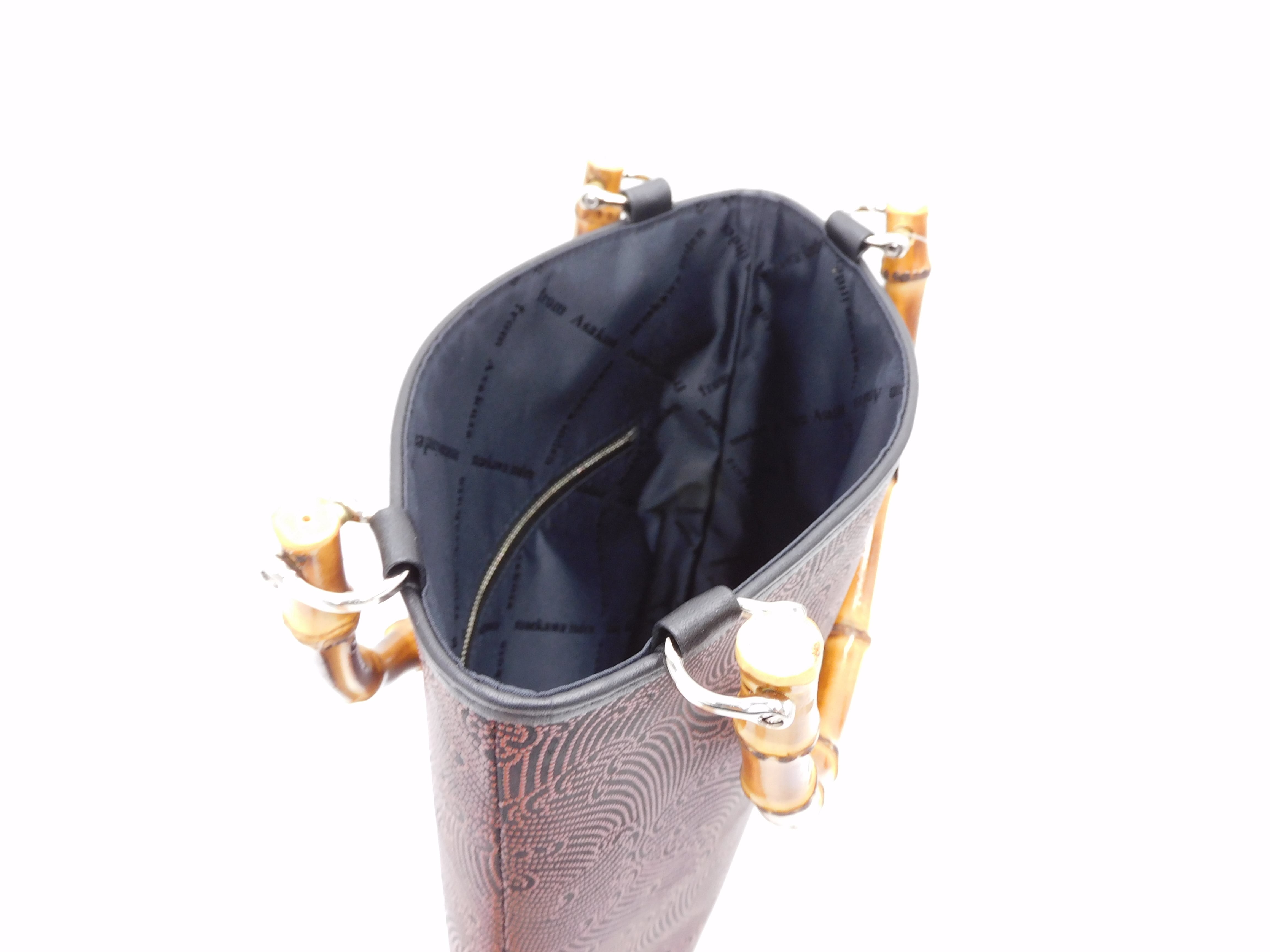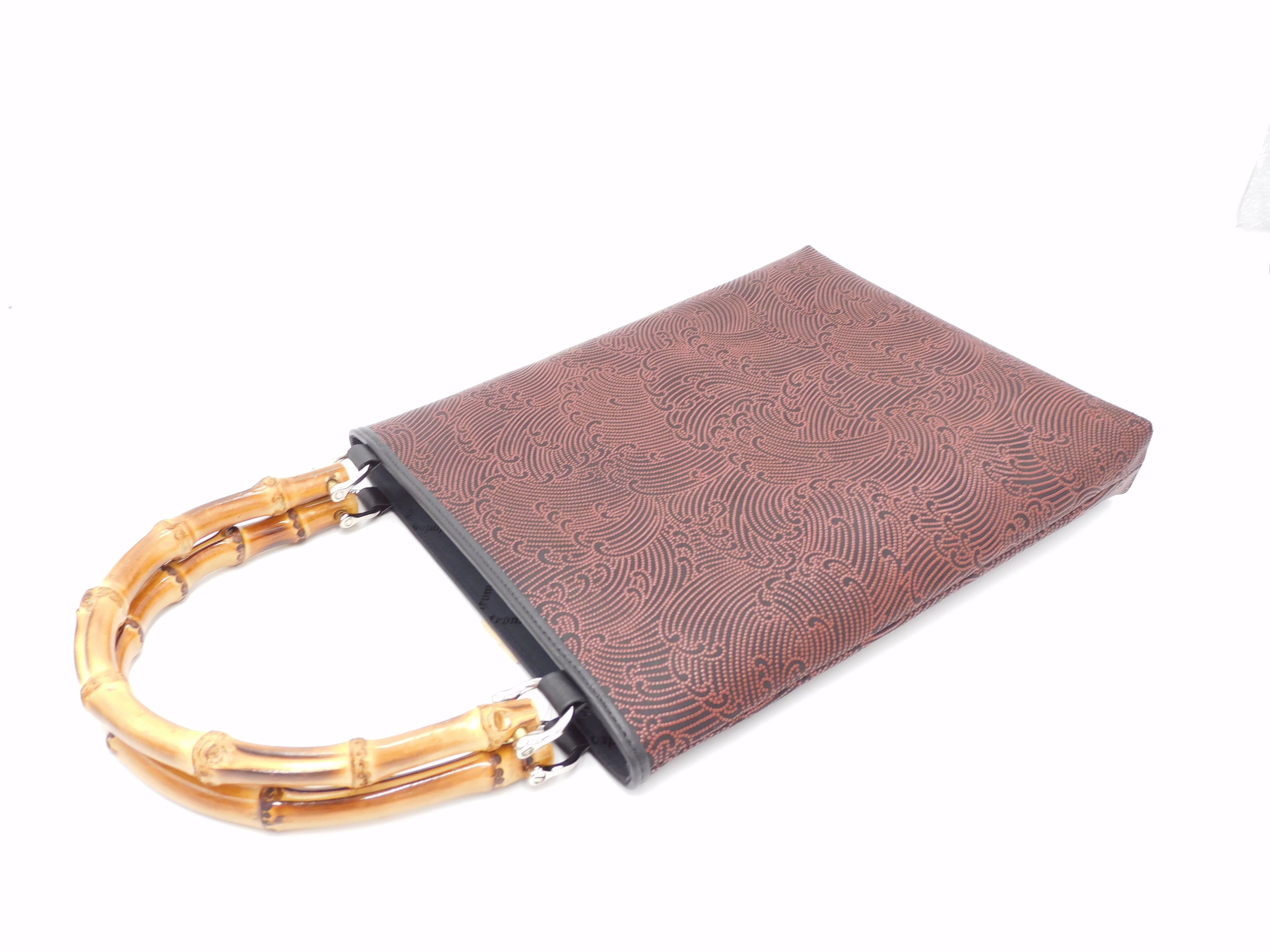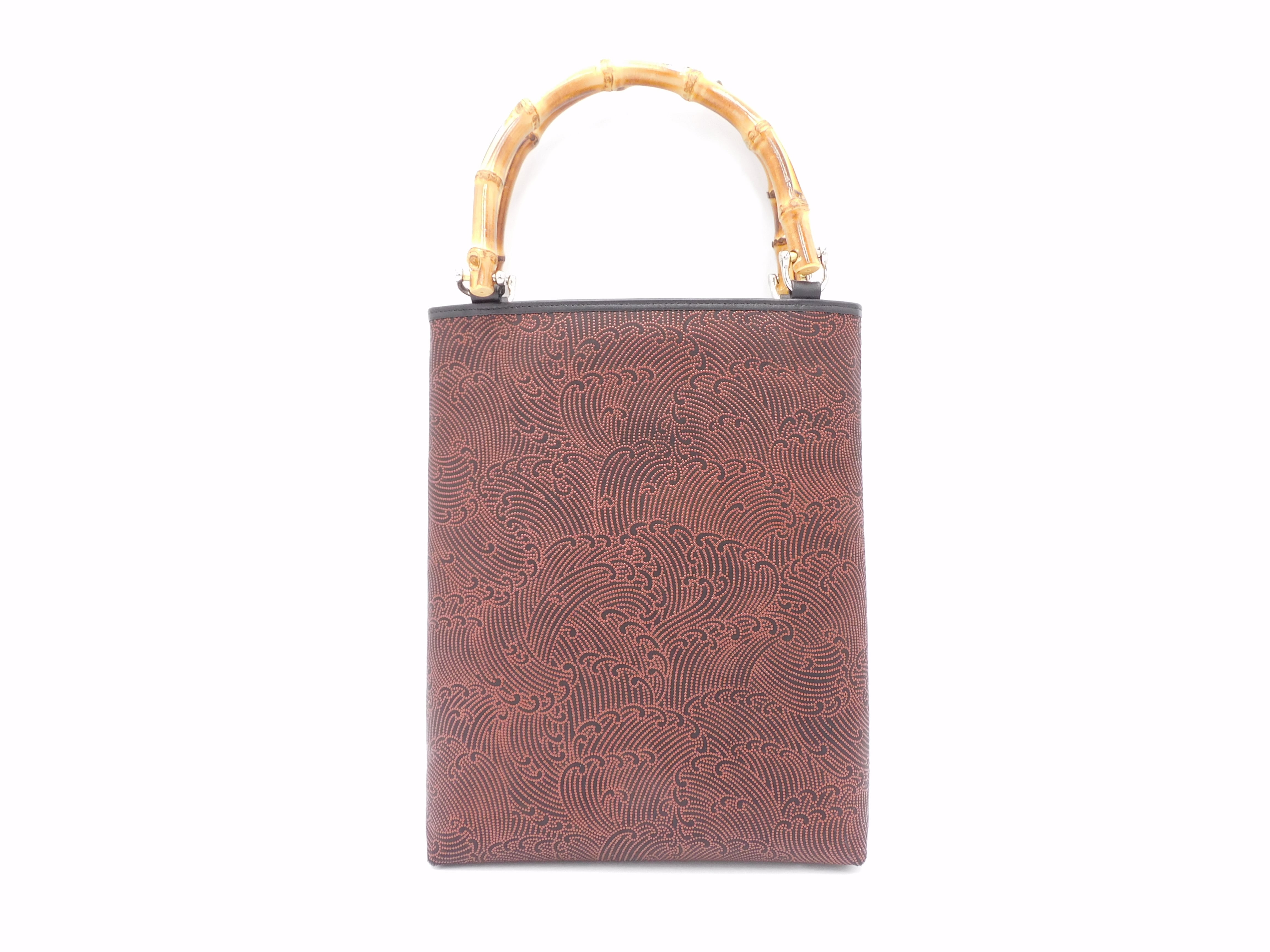 伝統技法による鹿革と漆の美しい模様に、本物の竹の持ち手を合わせた手提げです。