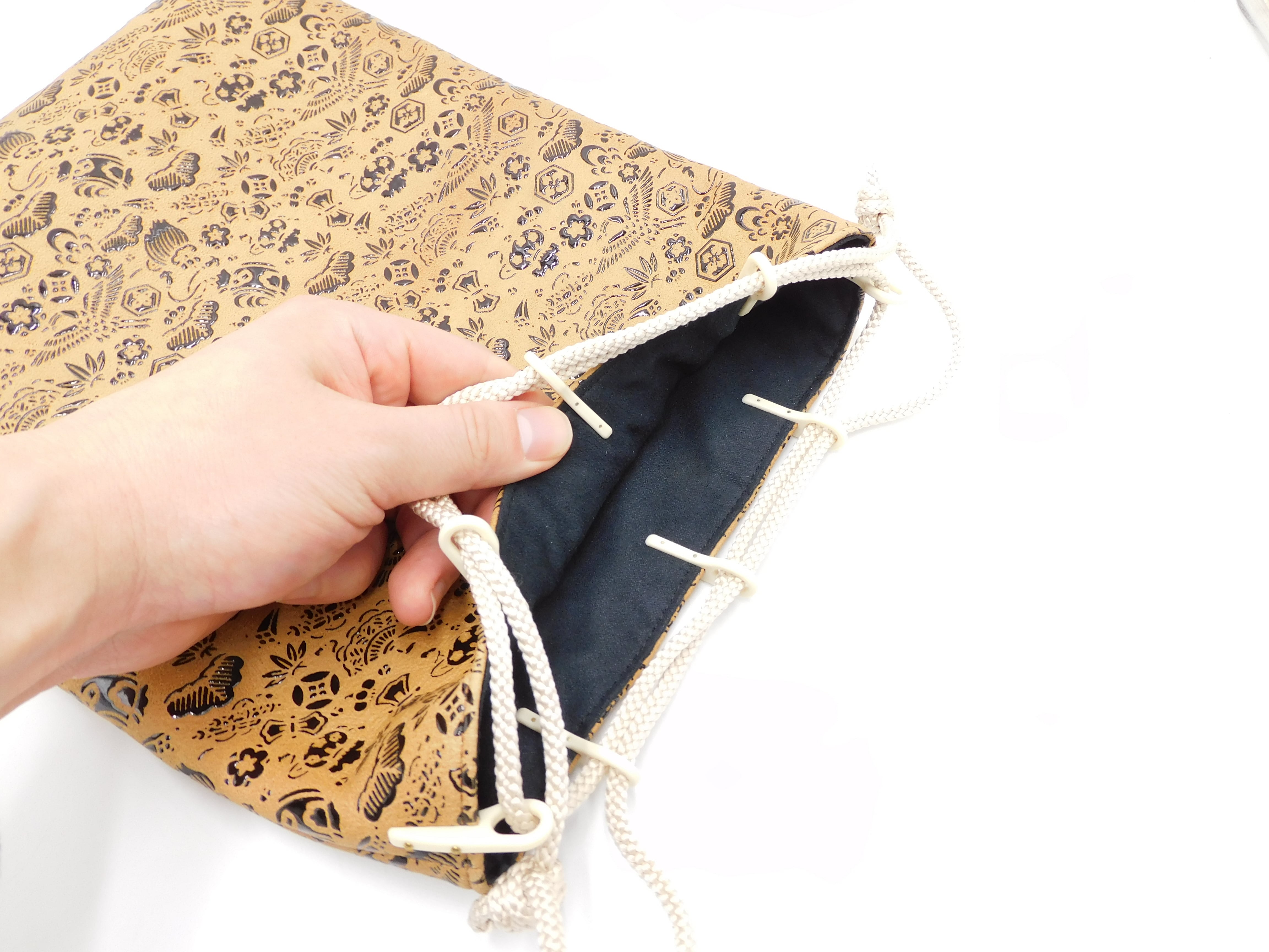 しなやかな鹿革に漆模様を施した印傳革を使用。使い込むほど柔らかさが増し、深みのある艶へと変化していきます。
